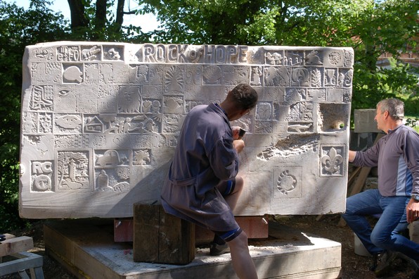 Der Rock of hope wurde in einem Zeitraum von 6 Jahren von etwa 300 Kreativen rundum an seiner Oberfläche gestaltet. Jeweils mit einer kleinen Reliefdarstellung. Er erzählt eine umfassende Story die ihren Ursprung jeweils in den inneren Bildern der Menschen hatte. Diese Bilder haben hier an dem 10 Tonnenblock das Licht der Welt erblickt und sind für alle Mitbürger gut sichtbar und begreifbar (!).